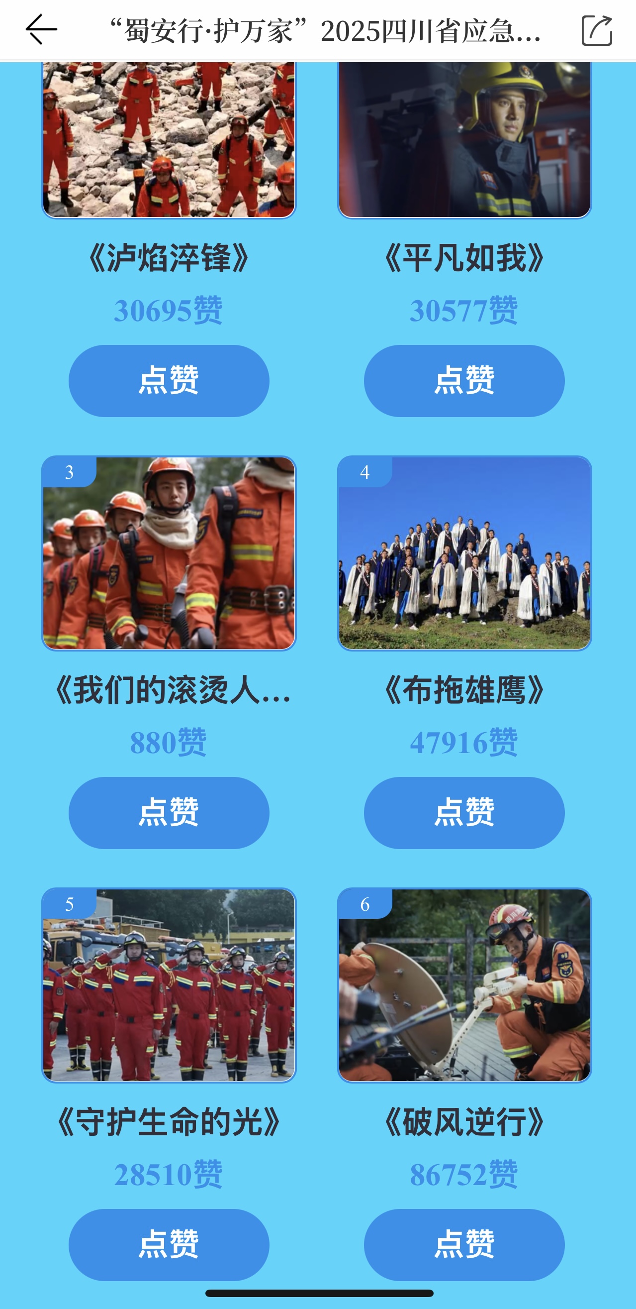活动期间,网友可前往四川应急微信公众号、封面新闻客户端活动页面,观看展播视频,微信用户每天可点赞10次,封面新闻客户端注册用户可点赞10次。展播结束后,点赞排名前16支队伍参加总决赛。